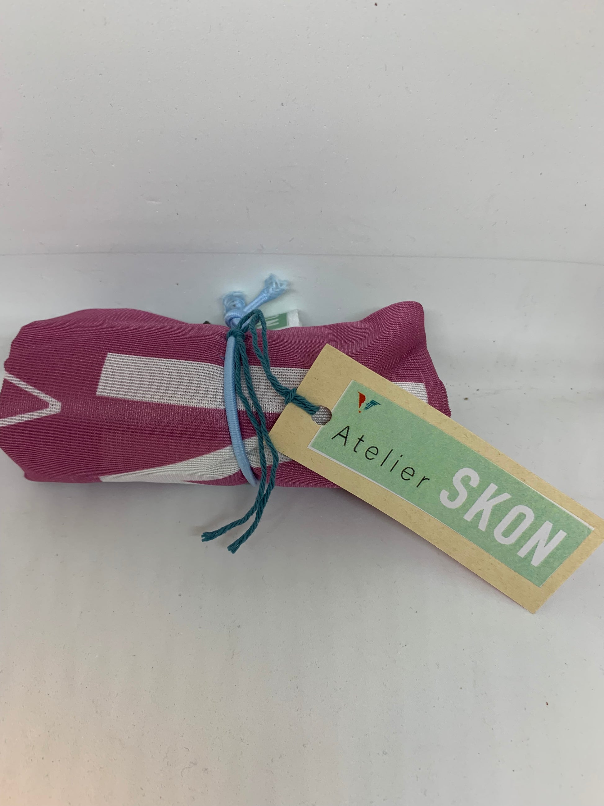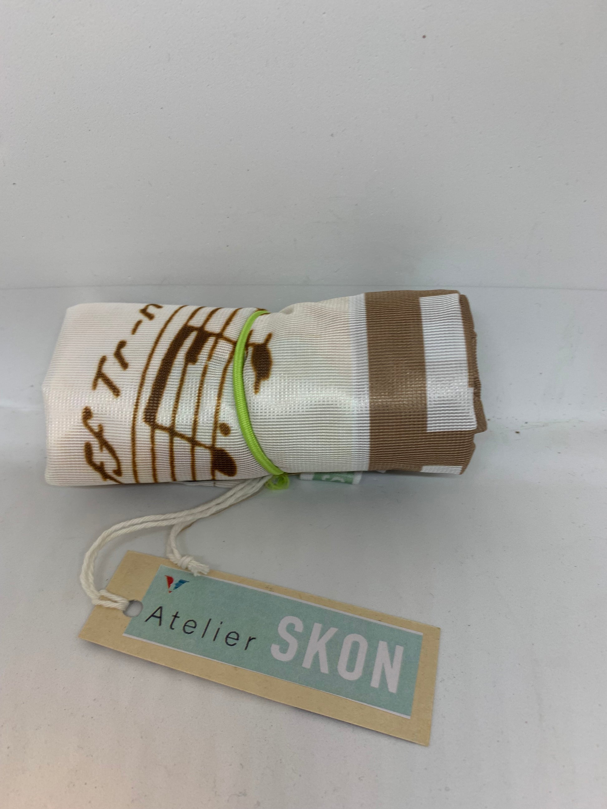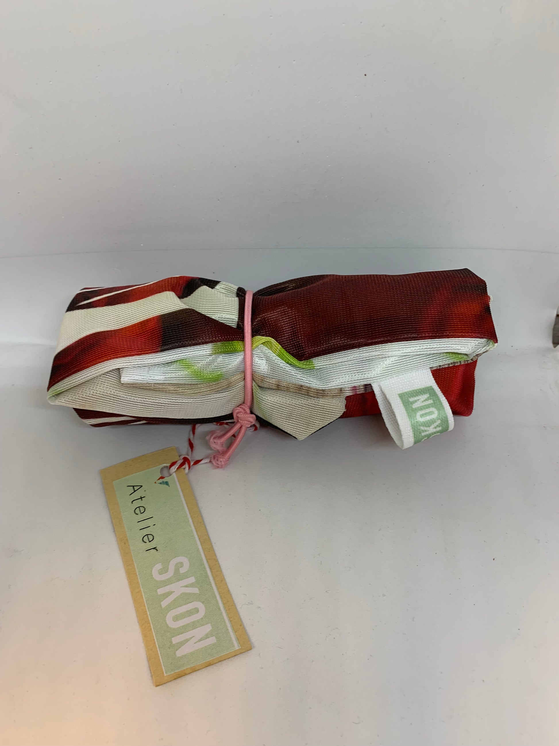 Een heel hendig opvouwbaar taske gemaakt van dun maar mega stevig stof van oude stoffen promotie banners van, dutch design week Berckelhof, en vlaggen van Daf en Vitalis. In vele vrolijke kleuren en printjes allemaal uniek, handig voor in je handtas, auto op reis of de fiets.
