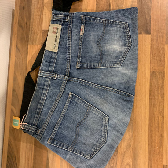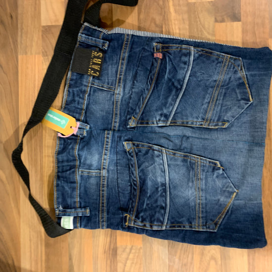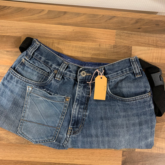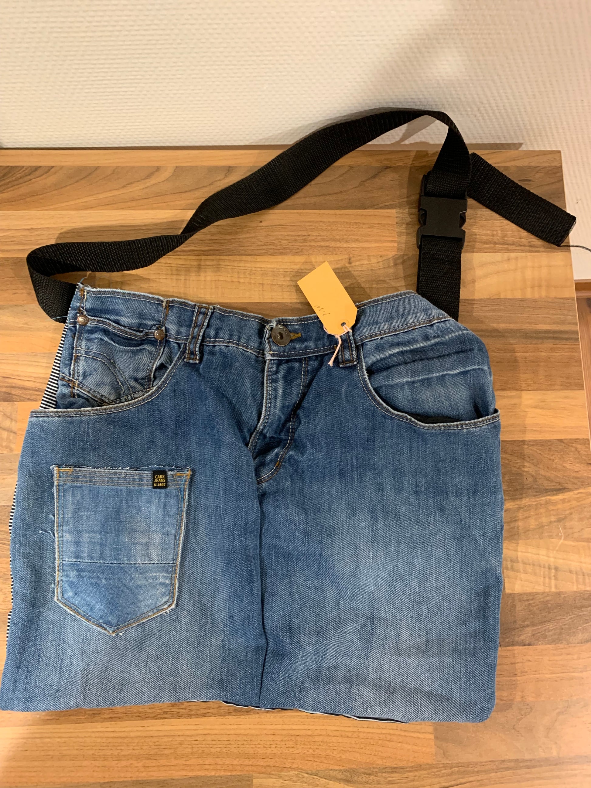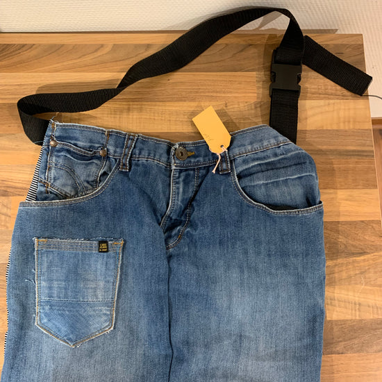 Ze zijn gemaakt van oude spijkerboxen en en dubbel gevoerd zodat er extra zakken in zitten. Zijn voorzien van een stevige brede verstelbare band met klipsluiting.