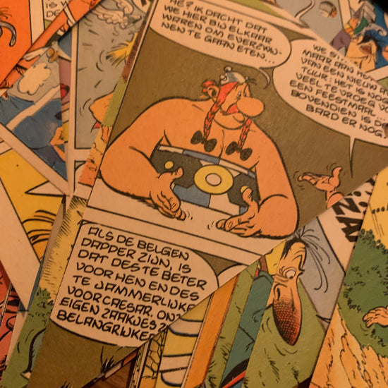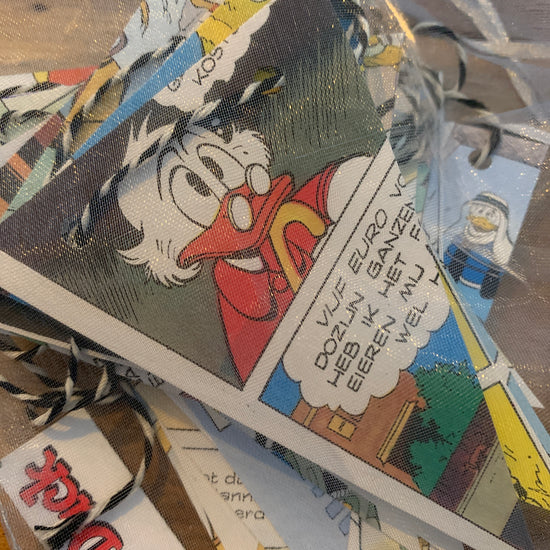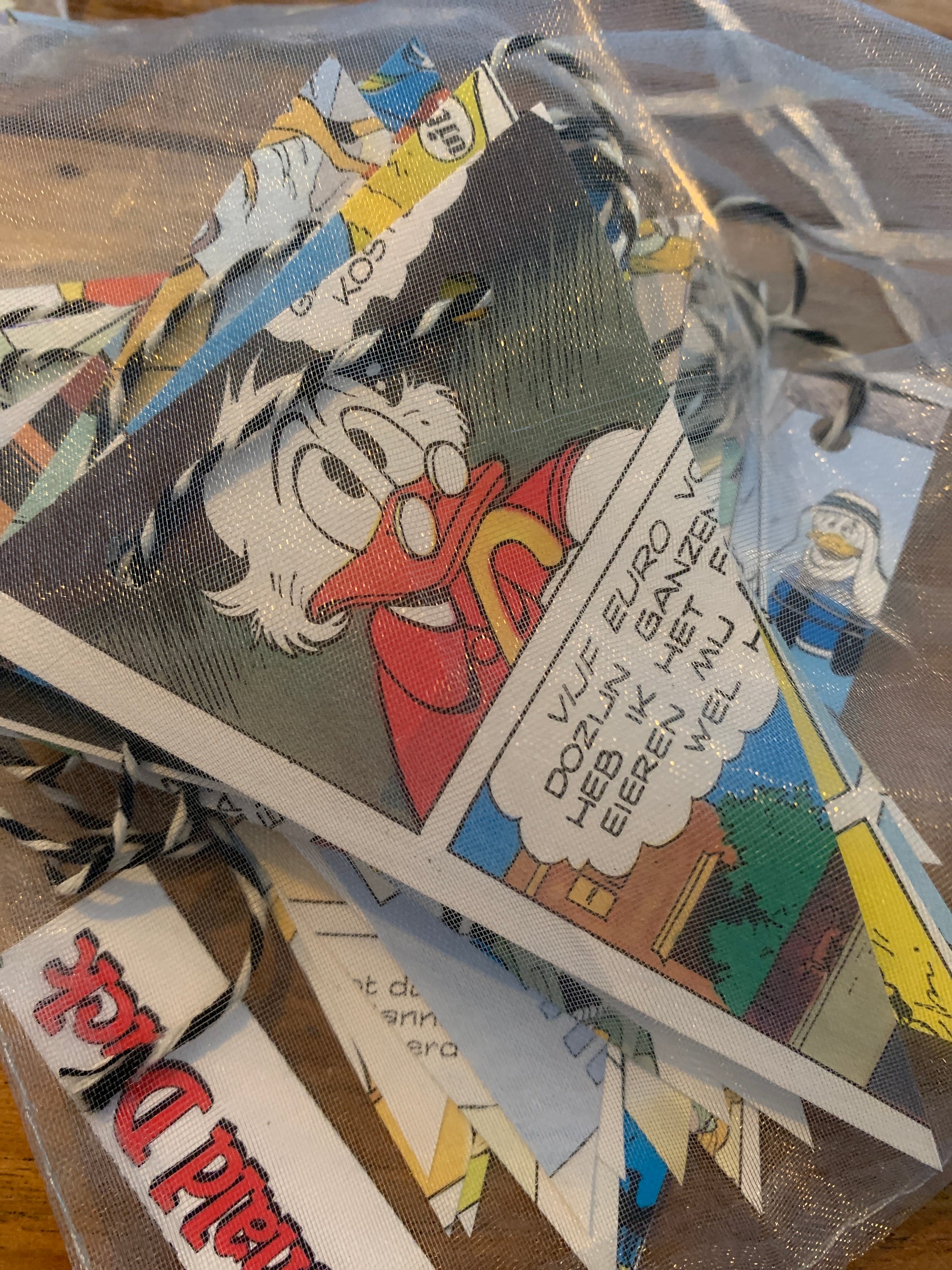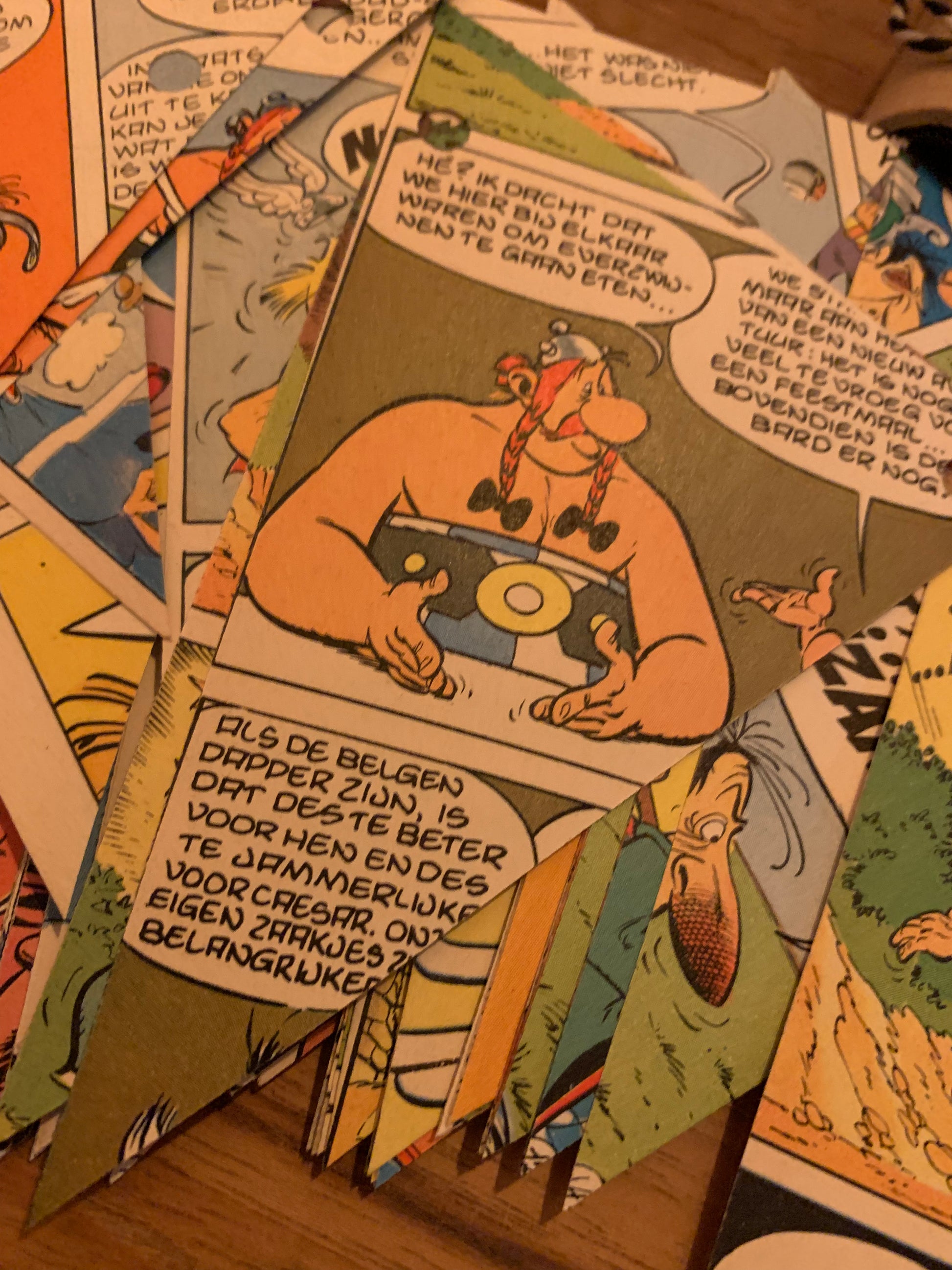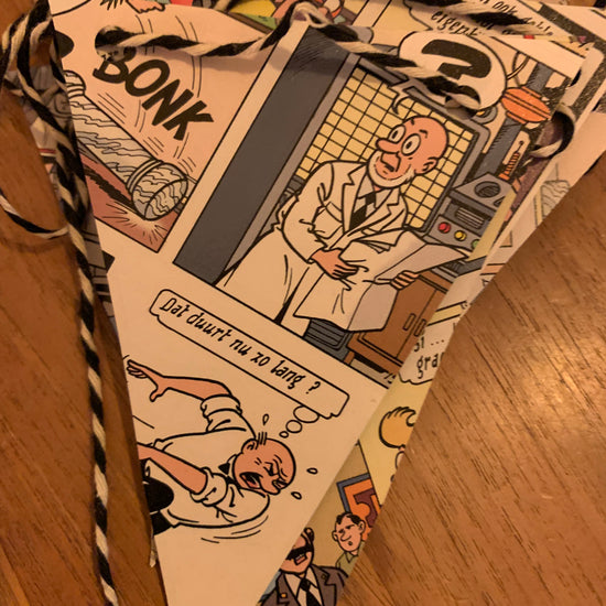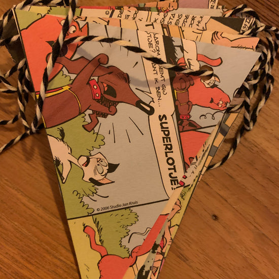 SKON kleine leven is een feest slingertje gemaakt van oude stripboeken, bladmuziek en Bosatlas.