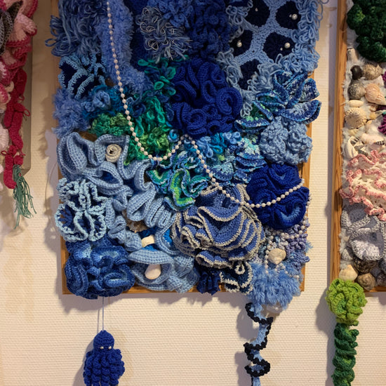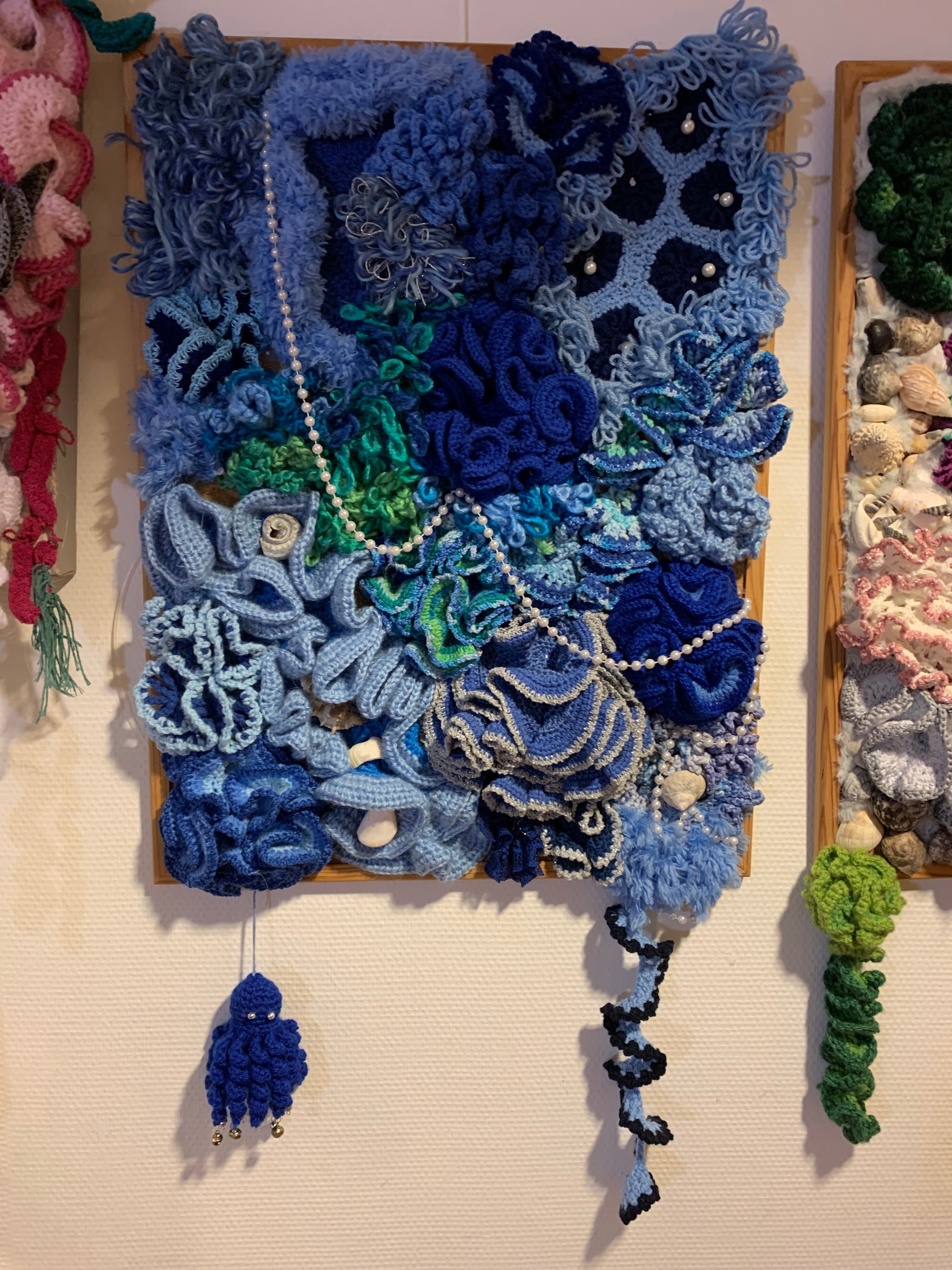 De oceaan en de dieren en het koraal worden berdeigd door al het afval en plastic, met vele verschillende handen werd er van restjes  wol en garen nieuw koraal gehaakt, ze werden vervaardigd in een koraal schilderij.  Ze werden op een prikbord uit de kringloopwinkel vastgemaakt. Afmeting ongeveer 60x45 cm.