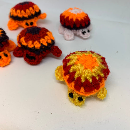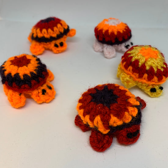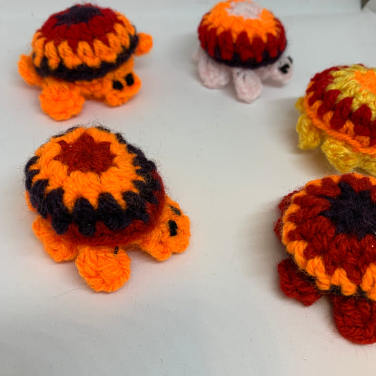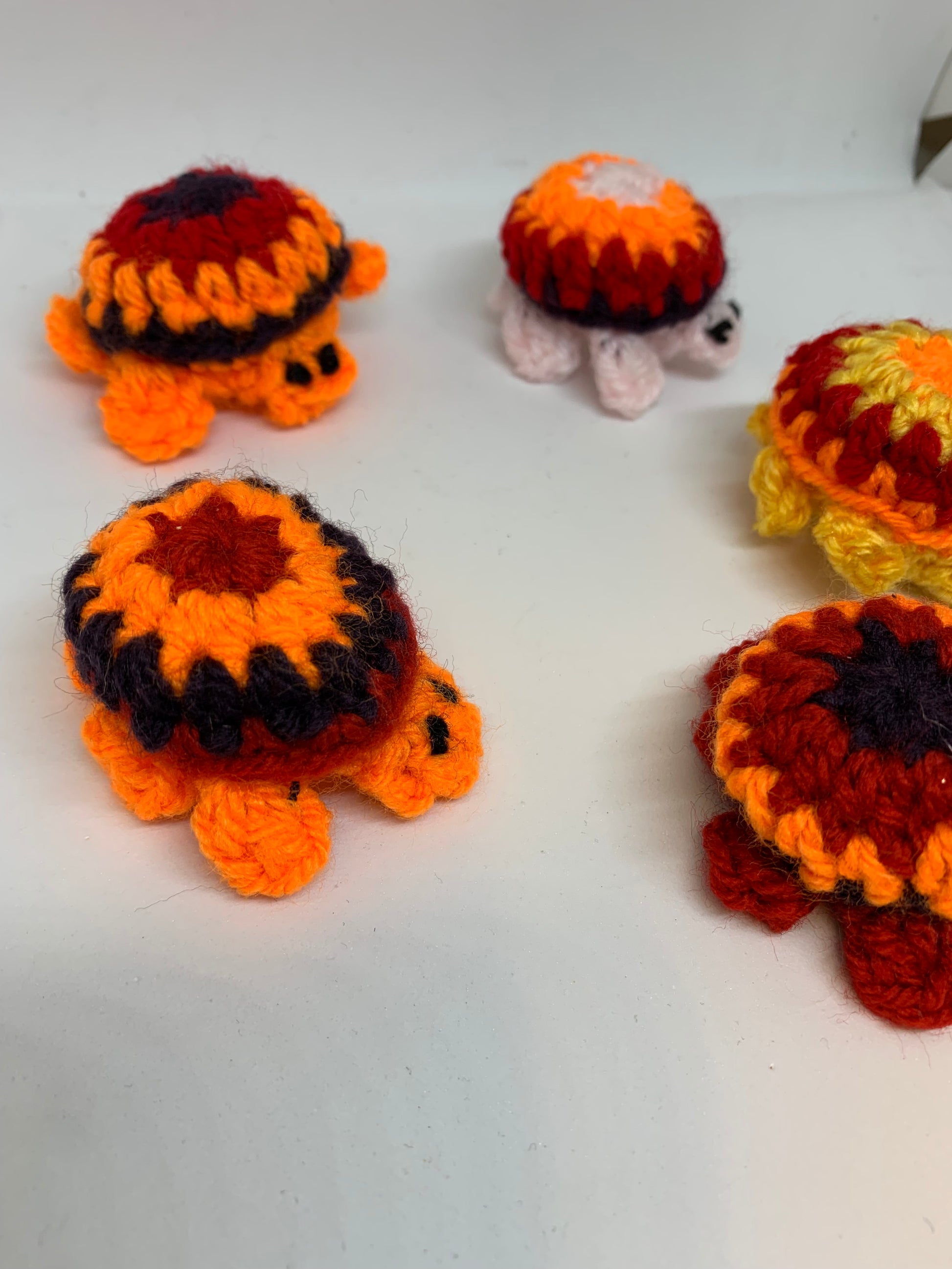 De ze mini Honu ofwel schildpadjes zijn gemaakt door Gerrie, vrolijk van kleur ( verschillende kleuren), ze zijn vervaardigd van restjes garen.