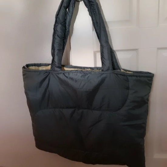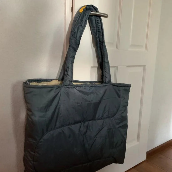 Van een oude slaapzak maakten we in Atelier Skon enkele super grote maar lichtgewicht tas genaamd de shopper topper, Ideaal voor als je uit logeren gaat, het strand of voor als je van plan bent eens goed en duurzaam te kleur grijs.