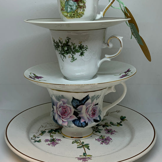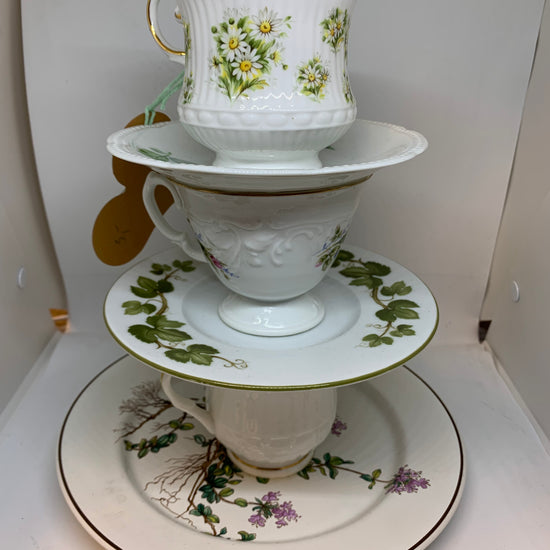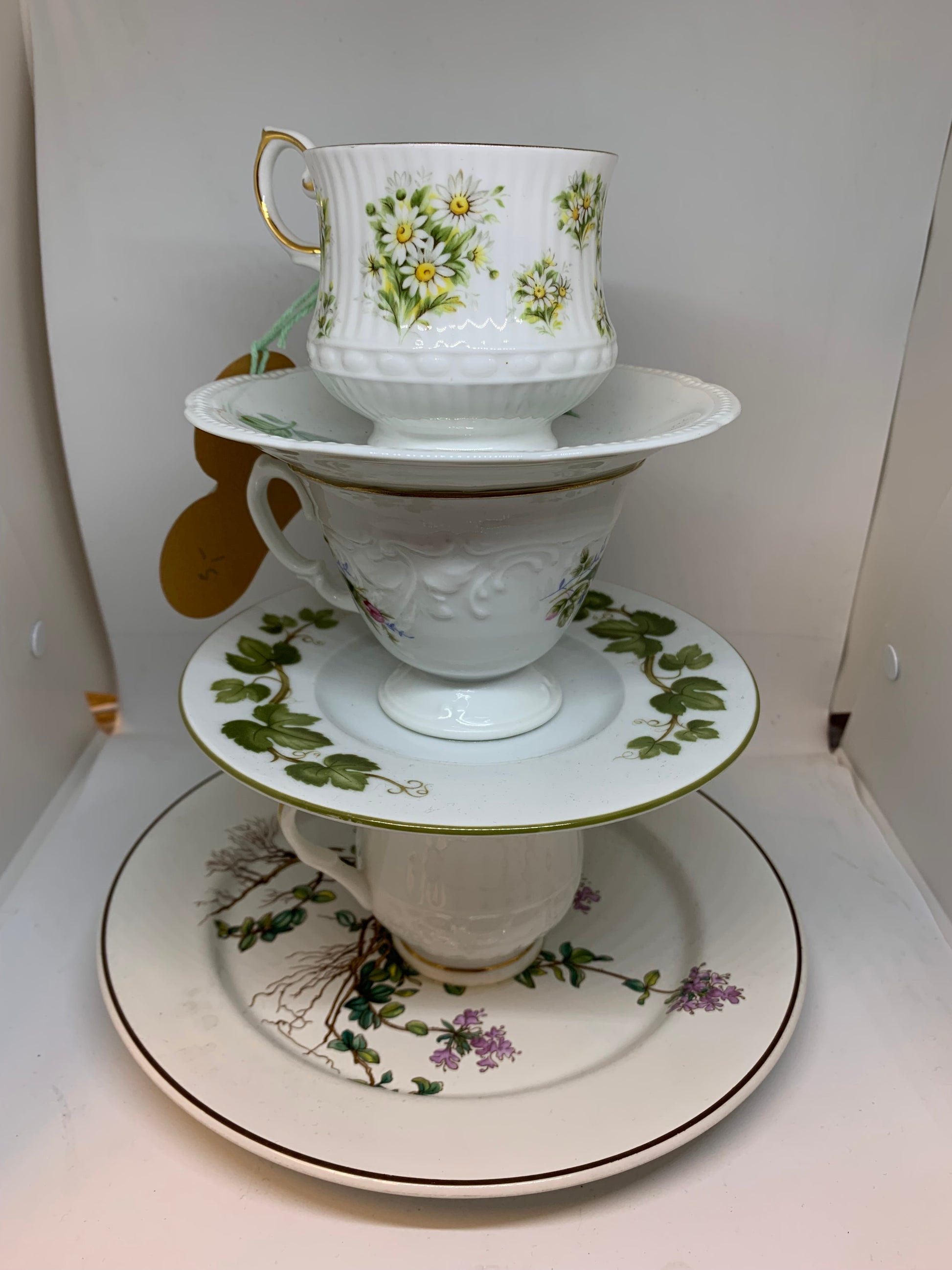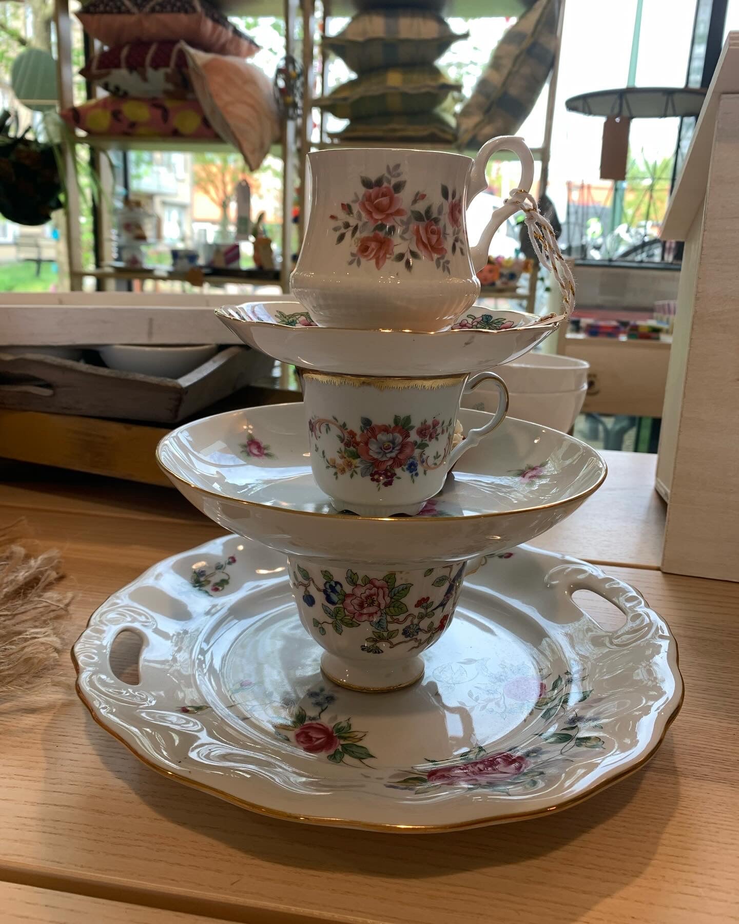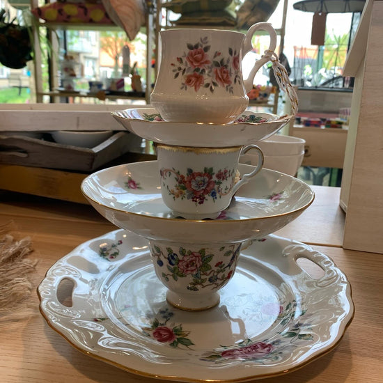 Een etagère opgebouwd uit verschillende soorten servies. Het servies krijgen we van Kringloopwinkels of is een gift van particulieren. De deelnemers maken samen mooie combinaties van het servies en het resultaat is een etagère met drie etages. Genoeg plek voor heerlijke koekjes, gebakjes of chocolade. Zo maak je de blits op ieder feestje (of gewoon voor jezelf. Dat mag natuurlijk ook!)
