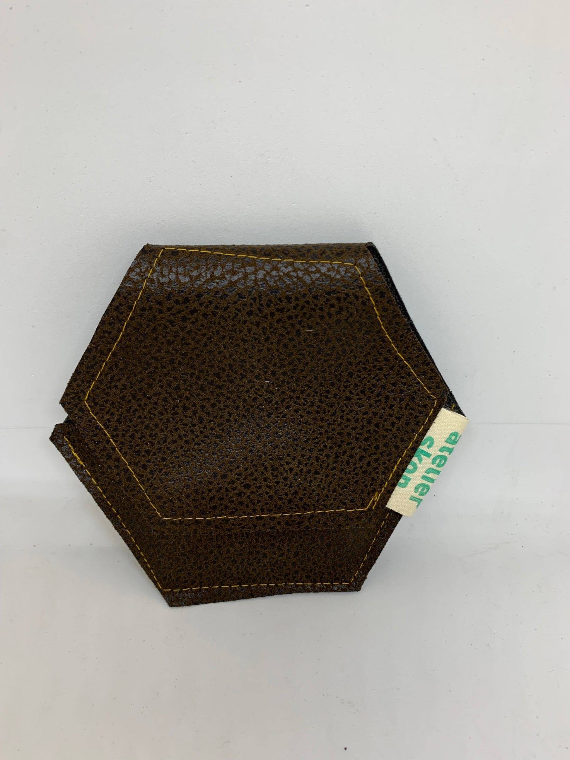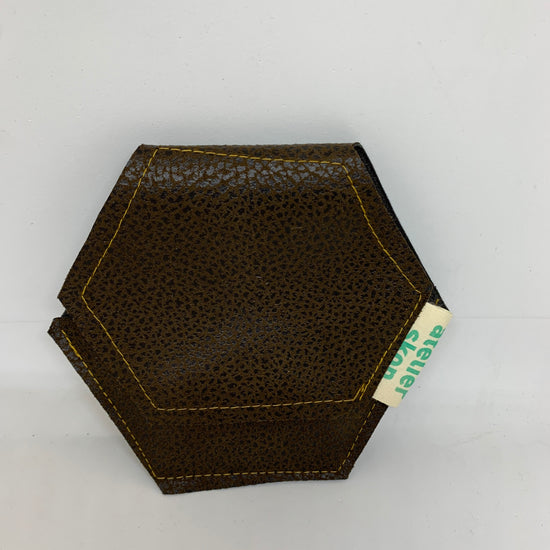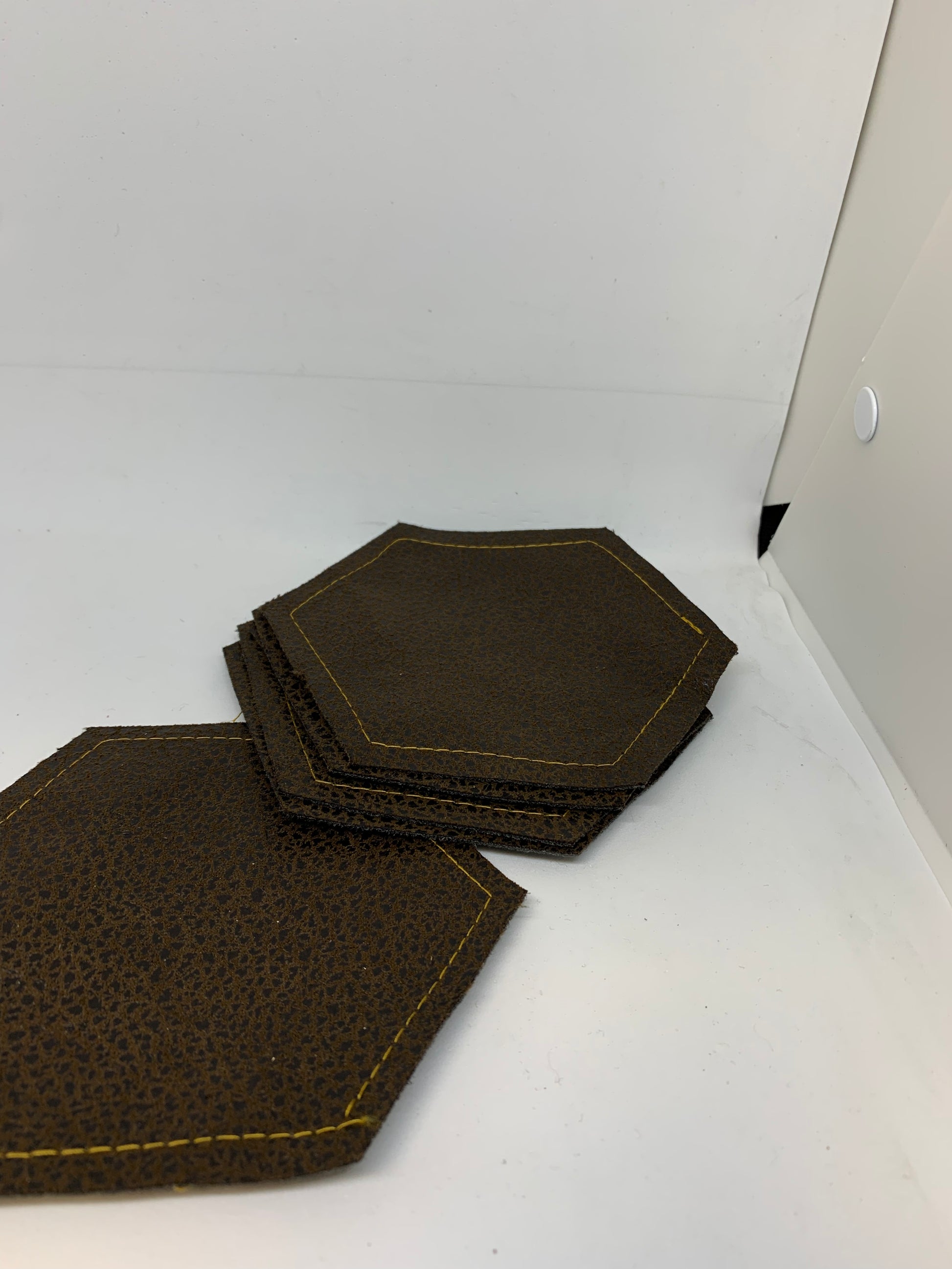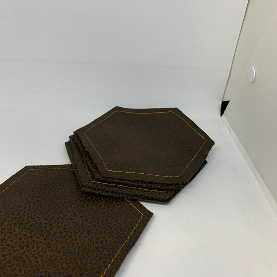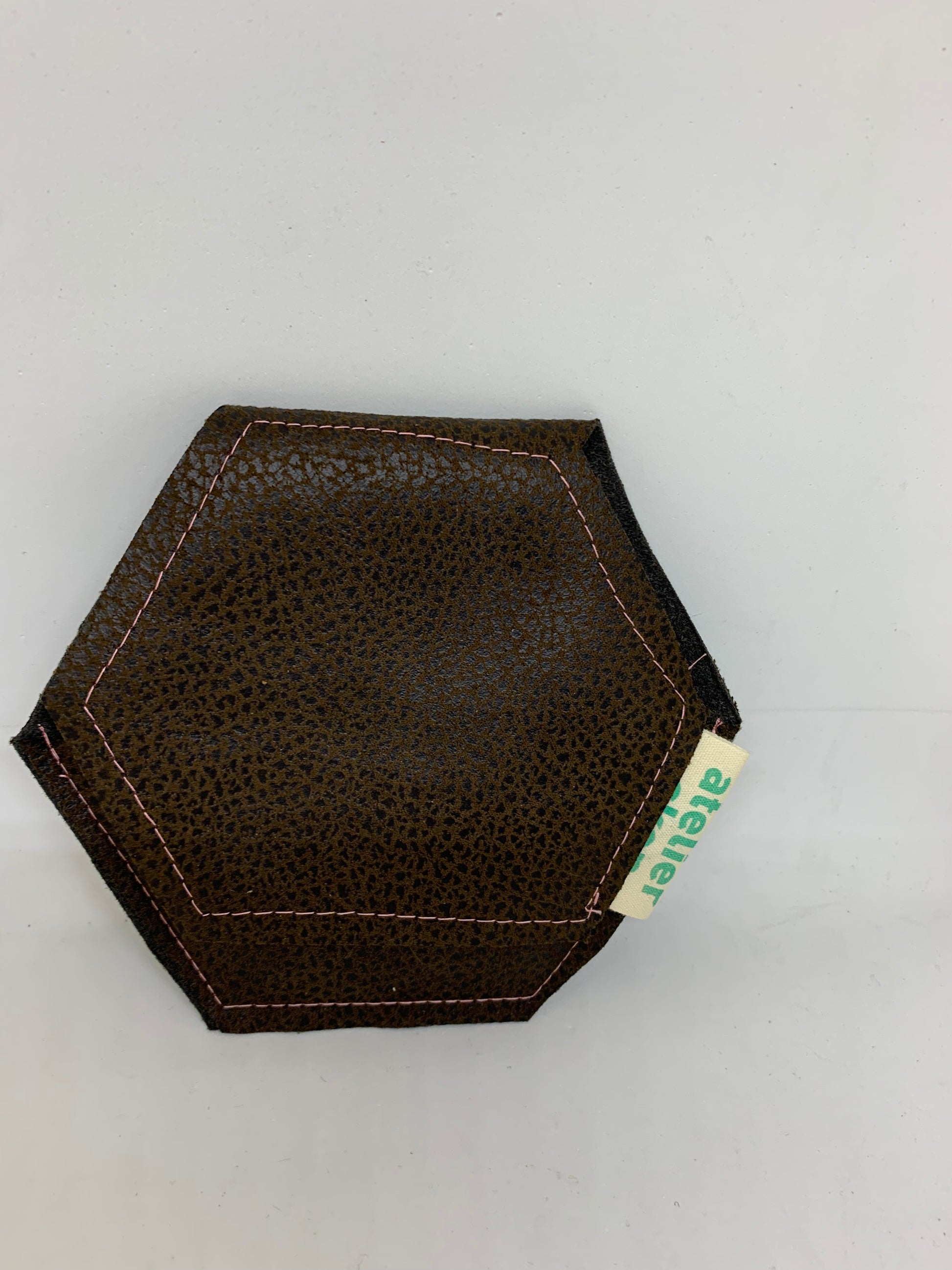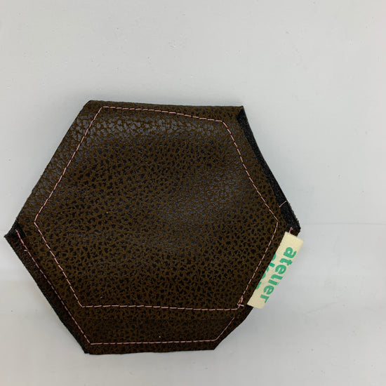 Deze Skonderzetters zijn gemaakt van reststukjes leer en verpakt in een SKON hoesje. We hebben ze met roze en beige stiksels.