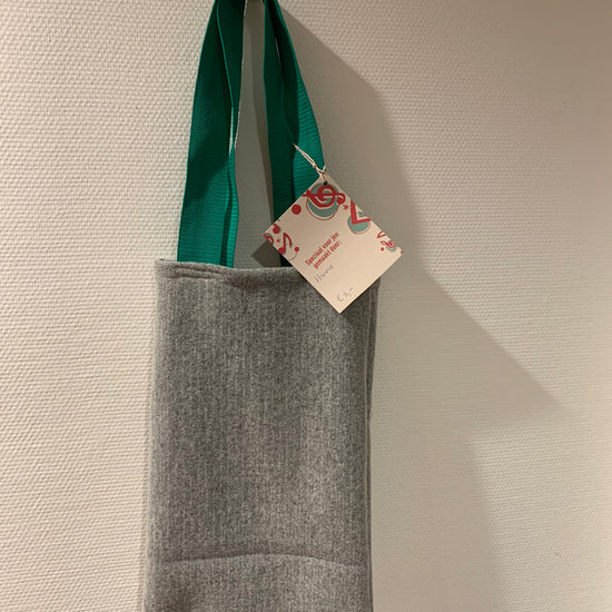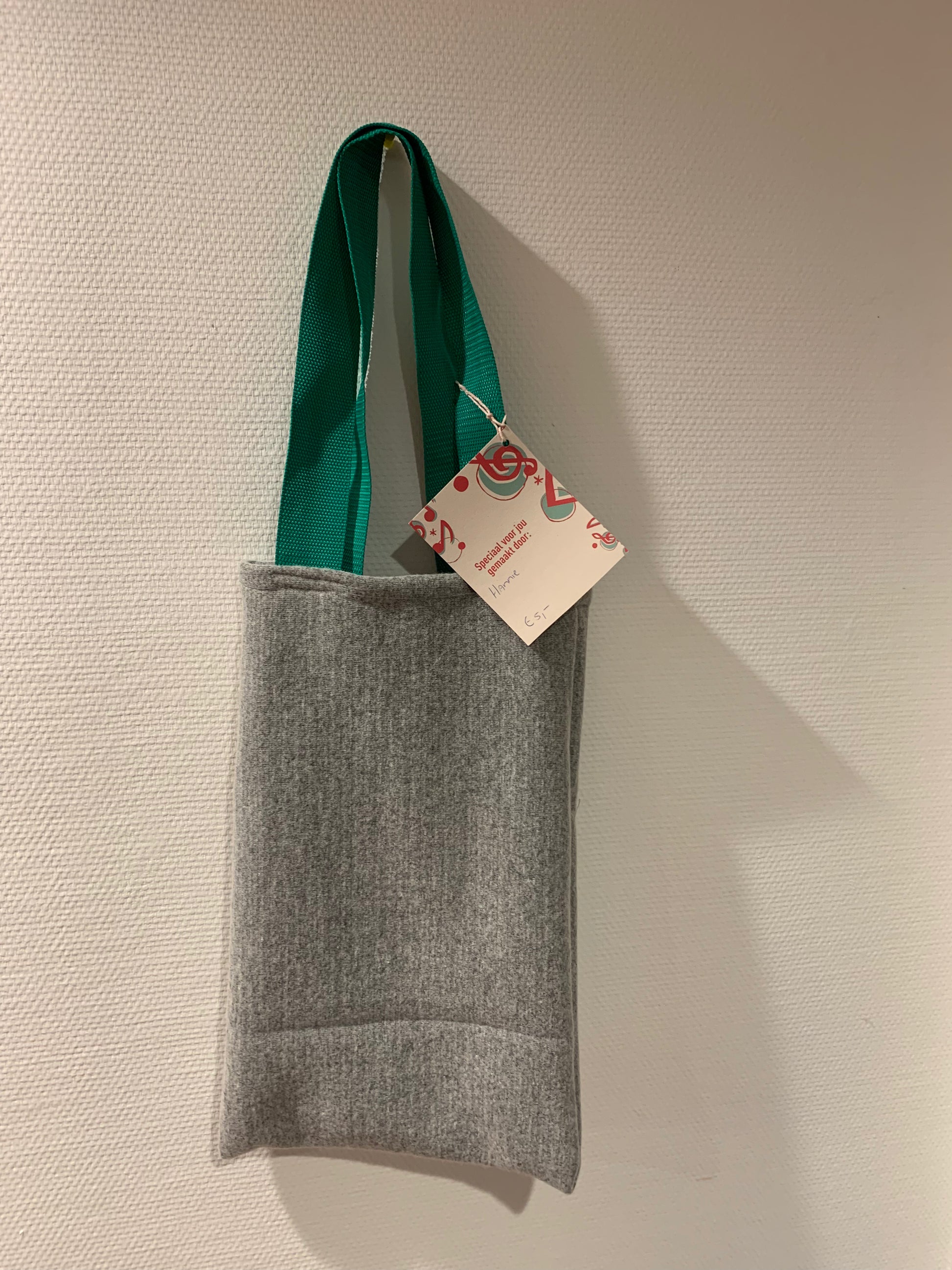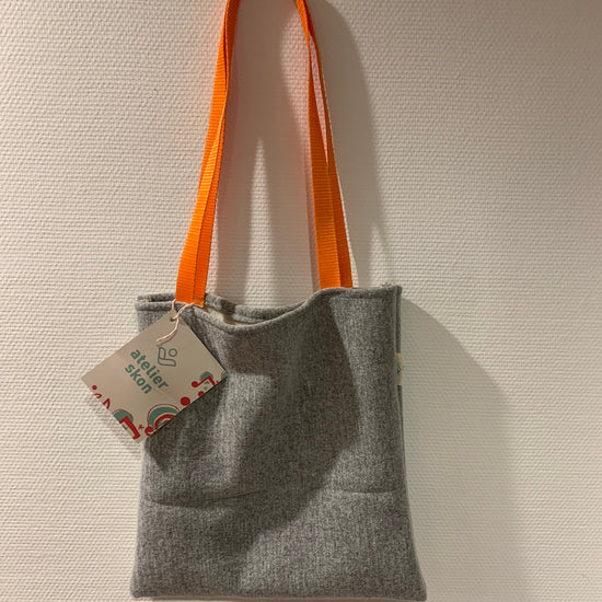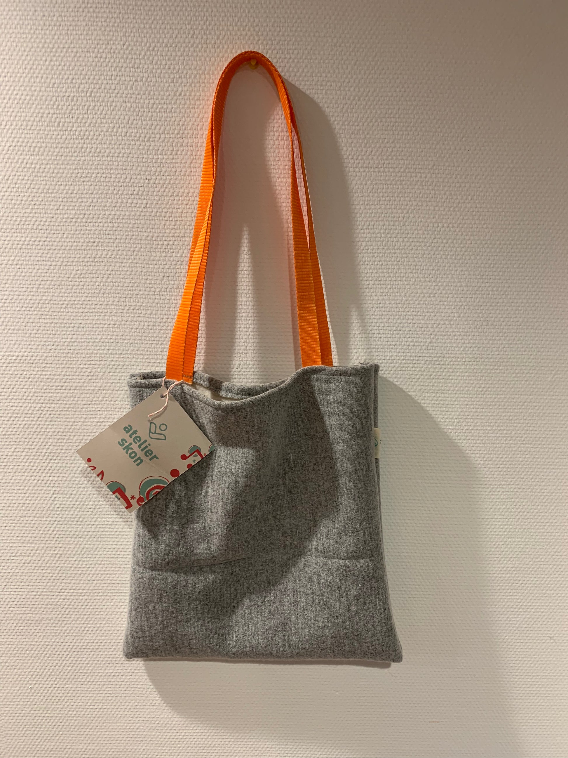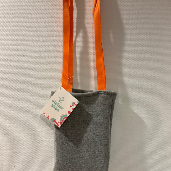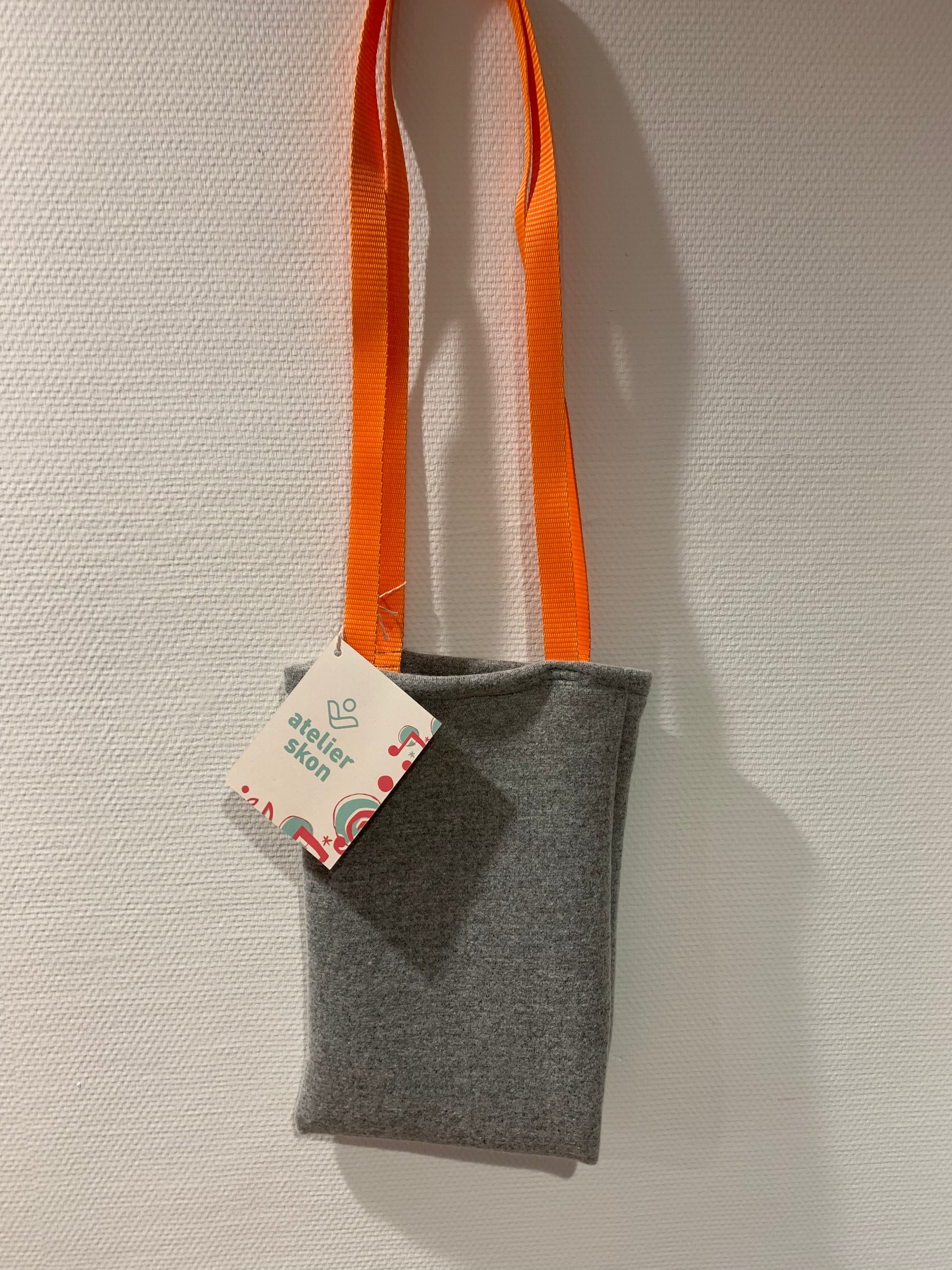 Super zacht grijs grijs taske voorzien van een oranje of groene taasenhengsel.
