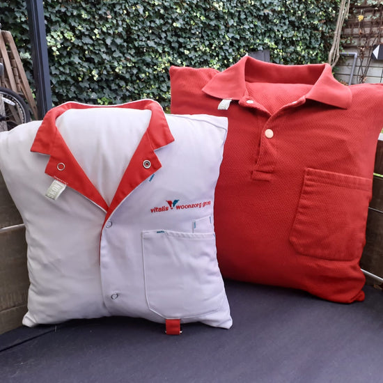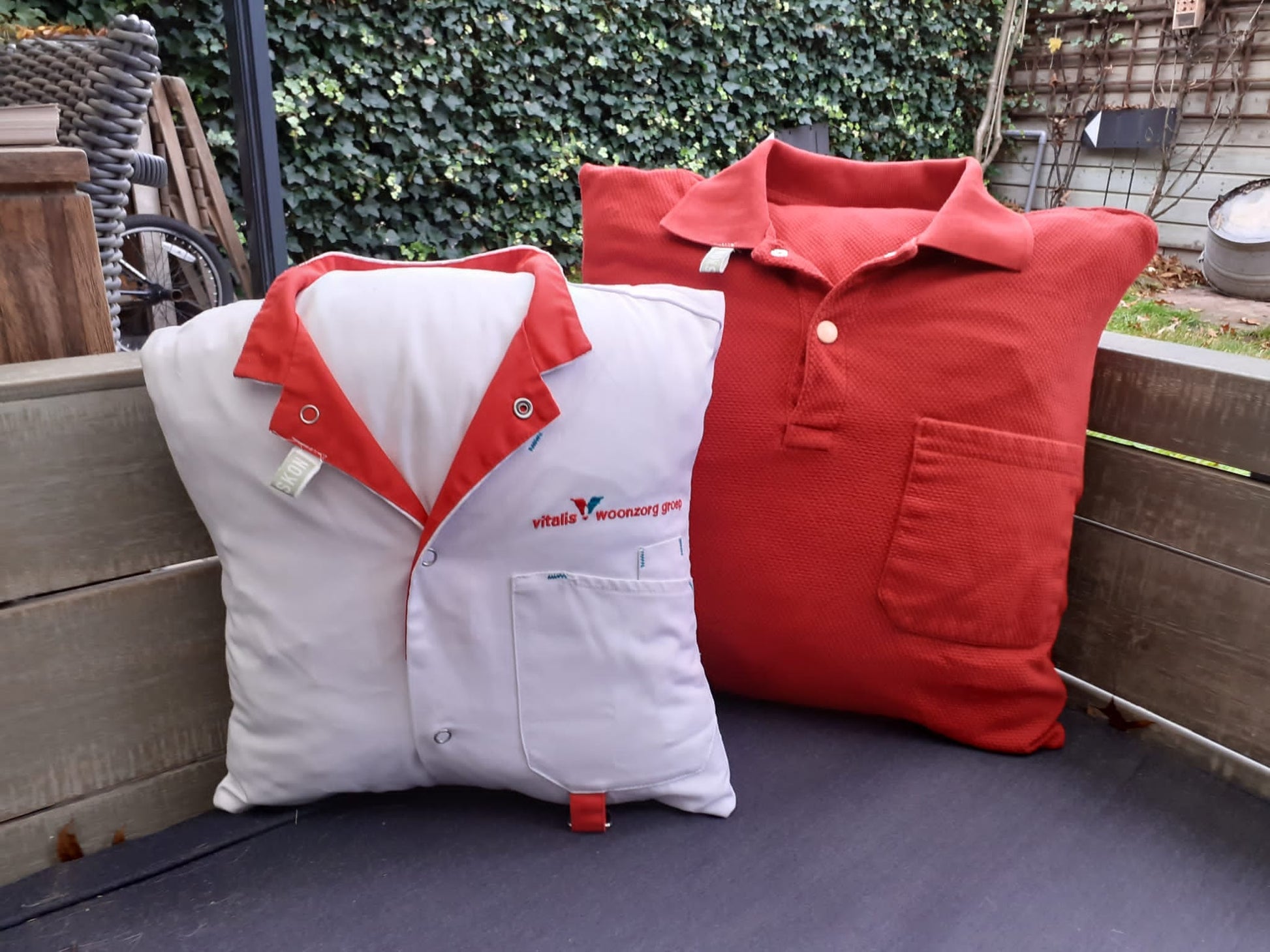 Home made kussens gemaakt van de oude uniformen van Vitalis medewerkers. Want zeg nu eens eerlijk wie wil de fanatische medewerkers van Vitalis nu niet een knuffel geven.